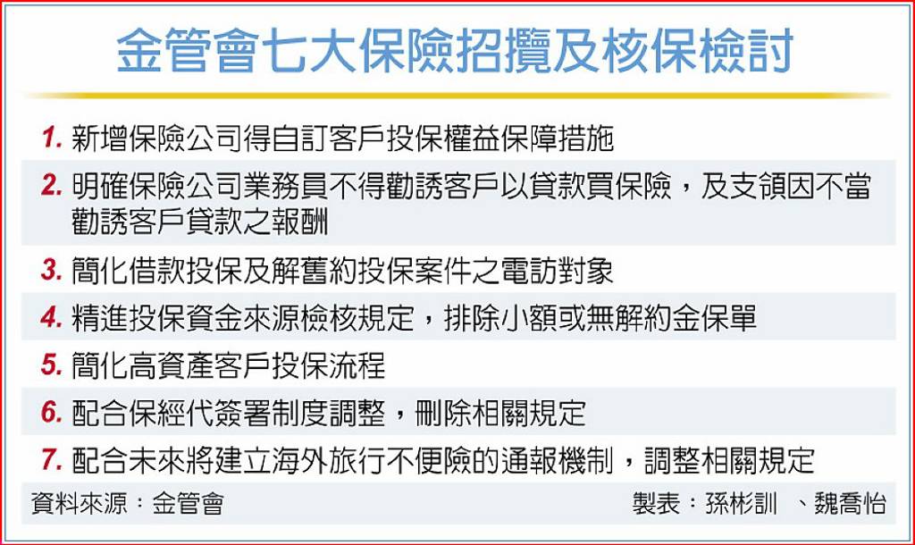 金管會預告,為提升國人投保便利性、簡化保險業對高齡客戶、借款買保險及解舊約買新約案件執行的關懷措施或作業流程、精進保險業作業效率,兼顧保戶投保權益,金管會做七大保險招攬及核保檢討。金管會保險局副局長蔡火炎表示,相關內容不是「鬆綁」,是「務實的檢討」。