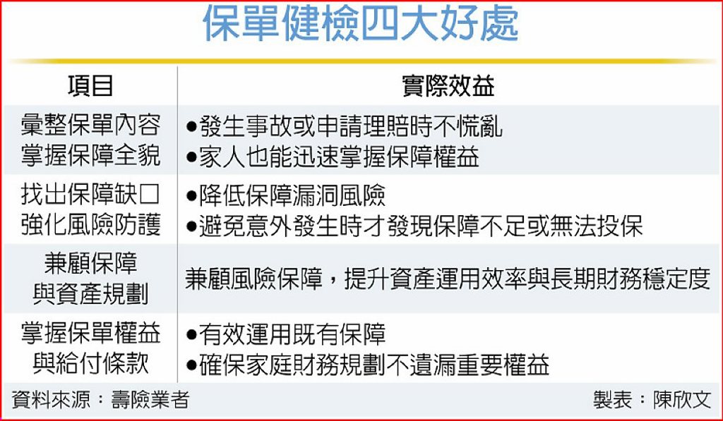 歲末年終,不少民眾會安排健康檢查,透過檢視身體狀況調整生活與作息,但壽險業者提醒,除了身體需要定期檢查,保單同樣需要「健檢」。隨著人生階段轉換、家庭結構改變與經濟條件變化,原有的保險配置未必仍符合當下需求,若未適時調整,恐使保障出現缺口。